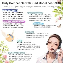 [Please Confirm Your iPad Model Before Purchase] - KIROSA iPencil is designed for 2018-2025 iPad models, ONLY compatible with New iPad Pro M4, iPad Air M2/M3, iPad A16, and iPad 6/7/8/9/10/11 Gen, iPad Pro 11" 1/2/3 Gen, iPad Pro 12.9" 3/4/5/6 Gen, iPad Mini 5/6 Gen, iPad Air 3/4/5 Gen. *NOT Compatible Models: iPad(1. 2. 3. 4. 5th gen), iPad Mini(1. 2. 3. 4th gen), iPad Air (1st. 2nd gen), iPad Pro 12.9-inch (1st. 2nd gen), iPad Pro 10.5-inch, iPad Pro 9.7-inch. PRESS AND PLAY - Super easy to use, just press and play. KIROSA pencil for ipad features a button switcher design, which prevents accidental touches and saves power. RGB Battery Level Indicator -- there are 3 colours of light change on the pen for ipad for a real-time view of power changes. Easy to carry and store that the stylus for ipad can be attached magenetically to the side of your device. USB C FAST CHARGING - With the same charging method as pencil 1st generation for iPad, KIROSA stylus pen for ipad can be charged not only directly from your ipad, but also from other devices with USB-C pork, e.g. laptops or power banks. Fast Type-C charging in 25 minutes. Up to 13 hours of continuous use. Standby time up to 365 days. When lying idle for more than 20 minutes, the stylus pen for ipad will automatically power off. HIGH PRECISION & PALM REJECTION - This newest USB C ipencil 1st generation comes with 1.5mm fine nib, with pixel-level accuracy, offering the same writing experience as ipencil 2nd generation. 4 nibs are longer lasting. No glove required, palms can touch the screen with ease without fear of creative interruption. Perfect for online study, taking notes, working, drawing, recording, enjoying leisure. SENSITIVITY TO TILT - USB C pencil 1st generation for ipad can easily vary line thickness by changing its angle. Sketch, take notes, color, sign and record could be achieved by one stylus pen for ipad, no lag, low latency, effortlessly interacting with the iPad. It feels like a traditional pencil in your hand, but is more powerful, perfect for students, office workers, illustrators, artists, creatives. [Note: it doesn't support pressure-sensitive and magnetic charging.]