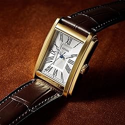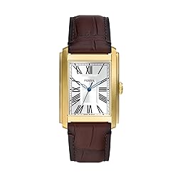 TIMELESS COMFORT: An instant classic, Carraway watches for men are thoughtfully designed down to every last detail; with a two-layered dial, curved-for-your-wrist case & a leather strap with soft nubuck lining, it's as timeless as it is comfortable CASE & MOVEMENT: 30mm case, 22mm band width, hardened mineral crystal lens resists scratches, accurate Quartz movement with 3-hand analog watch display, imported men's Fossil watch DIAL: One of many Fossil watches for men, this quartz watch features a rectangle gold stainless steel case, with a silver two-layered dial and black accents WRIST WATCH BAND: Brown, croco embossed genuine leather band with a secure adjustable buckle closure for a customized fit; interchangeable with all Fossil 22mm straps WATER RESISTANT MEN'S WATCHES: Up to 50m (165ft); wearable for short periods of recreational swimming and showering, but not diving or snorkeling; 5 ATM