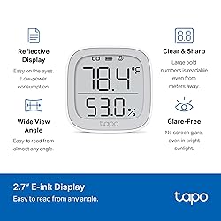 【*REQUIRES Tapo Hub】To utilize Tapo motion sensor T315, a Tapo hub H100 (sold separately) and a secured 2.4 GHz Wi-Fi network connection are required. Tapo T315 communicates with the hub via the Sub-1G Low-Power Wireless protocol, which provides extended battery life for the sensor and a wider coverage area compared to Wi-Fi. 【2.7" E-ink Display】Displays temperature & humidity, comfort level, battery status, and signal strength. Features low-power consumption, wide viewing angle, crisp & sharp visuals, and no screen glare. 【Real-Time & Accurate Monitoring】Featuring the Swiss-made sensor chip, Tapo T315 provides high accuracy and real-time data updating every 2 seconds. (Accuracy: ±0.54°F, ±3% RH) 【Free Data Storage & Visual Graphics】Records temperature and humidity data and generates periodic data summaries. 2 Years of Data Export for Free! 【Long-Lasting Performance】The Tapo Smart Temperature and Humidity Monitor uses two AAA batteries (included in package) and lasts for up to 2 years. (*Battery life of up to 2 years is based on TP-Link’s laboratory results under normal use. Actual battery life may vary depending on working conditions.)