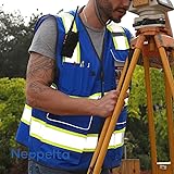 - Neopelta Quality Designed, Quality Made Blue Mesh Safety Vest with Pockets and Zipper Model No.: NPV2 Performance Features: 100% polyester ultra cool blue mesh fabric 2 inch wide high performance reflective tape with contrasting trim Zipper front closure with puller Mic tabs on both shoulders Pockets: Left chest phone and clear ID pocket with flap closure Phone pocket is big enough for latest iPhone, Google Pixel, Samsung Galaxy S, etc. Right chest 2-tier, 4-division pencil pocket with eyeglass loop Two lower outside cargo pockets with side hand-insert pockets Size: S-4XL The size chart is formulated based on the survey of body measurements to ensure a better suit. Please follow the fit guide and order right size accordingly with confidence. *If the safety vest is to be worn over a jacket, please order one size larger. Application: Great for construction, engineer, volunteer, public safety, security, warehouse and industrial workers, as well as recreational activities such as walking, cycling, jogging, running, dog walking and riding bike.