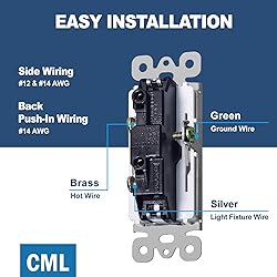 Single pole. 15A 120-277V. 10,000+ cycle test approved rocker switch Matte finish provides a tough, scratch-resistant surface that can withstand daily wear and tear Sturdy impact-resistant polycarbonate thermoplastic material for durability and construction for residential and commercial use Easy installation. Terminal screws accept copper or copper-clad wire (up to 12 AWG). Quick push-in terminals accept 14 AWG solid copper wire only. Break-off plaster ear ensures flush alignment UL & CUL listed. CML provides 3-year replacement. Matching screwless wall plates sold separately