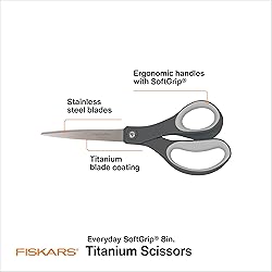 HOUSEHOLD STAPLE: Multi purpose adult scissors ideal for everyday household cutting tasks and a wide variety of materials including paper, cardstock, cardboard, photos and more LONG LASTING AND RELIABLE: Durable stainless steel blades feature a titanium blade coating that is 3x harder than steel; Stainless steel blades hold their sharp edge for long-lasting performance COMFORTABLE AND CONVENIENT: Ergonomic handle is sculpted to fit your hand and a soft handle provides added comfort and control; screw hinge can be taken apart to easily clean the blades QUALITY TOOLS FOR ARTS AND CRAFTS: From scissors and cutting mats, rotary and paper cutters, to classroom essentials, scissors for kids, and quilting and scrapbooking supplies, Fiskars crafting tools are designed to help you express yourself INCLUDES: (1) pair of Fiskars Everyday SoftGrip Titanium Scissors 8 inches in length; with Lifetime Warranty