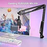 [USB/XLR Connection] The gaming microphone offers both USB and XLR connections, providing wide device compatibility for easy integration with PCs, or mixer and audio interfaces. The computer microphone gives decent performance in gaming recording scenario. [Crisp and Clean Audio] Experience nature audio sound quality with the gaming microphone kit. Whether you're engaging in intense gaming battles, podcasting, recording, or streaming, the podcast microphone XLR delivers crystal-clear sound reproduction, immersing you in a lifelike audio experience for an enhanced gaming communication. [Dynamic RGB Lighting] Elevate your gaming setup with the controllable RGB lighting feature of streaming gaming microphone. Immerse yourself in vibrant RGB effects, creating a mesmerizing gaming environment that reflects the intensity and excitement of your gaming scenarios. [Effortless Control] Intuitive function keys on the RGB computer microphone unlocks easy microphone settings, mute or unmute, control headphone volume, and adjust microphone gain, to enhance your gaming sessions across various gaming or streaming. [Noise Isolation and Sturdy Support] The gaming microphone set comes with a robust boom arm stand, providing noise isolation and a sturdy support for the dynamic microphone. You can enjoy clean audio recordings and uninterrupted communication in intense gaming scenes, while the stand ensures stability and durability for long-lasting use.