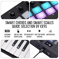 【Powerful keyboard】 Songwriters and Beat Maker Essential - USB powered MIDI controller with 25 mini MIDI keyboard velocity-sensitive keys for studio production, virtual synthesizer control and beat production. 【Wireless keyboard】It's very compact and portable, and you can connect it wirelessly to your device with Bluetooth, built-in 2,000 mAh battery can work for about 16 hours, you can easily slip this ultra-portable MIDI keyboard into almost any bag and take it with you to the studio, cafe or hotel to compose music. 【Music Production】 25 velocity-sensitive keys, 16 RGB backlit velocity-sensitive drum pads, 8 assignable rotary enconders, 2 Capactive touch stripes pitch bend to all your music studio plugins for mixing, tweaking synth controls and more. 【Smart keyboard】Compatible with Windows, Mac OS, Android and iOS,The K5 compatible with all digital audio worksstation, Ableton live,Fl Studio,Cubase,Logic Pro X,Bitwig,Reason,Studio One,GarageBand(iOS) etc., 【Scale feature】Integrate the smart chord and smart sound function, users can choose quickly through the keys. very suitable for setting this function during performance and practice.30 days money back and one year warranty.