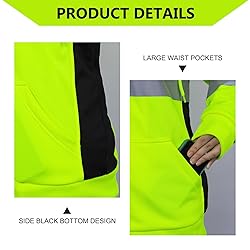 fleece Imported FABRIC:200g Fleece inner, full coverage, soft and comfortable, to provide warmth in the cold weather DETACHABLE HAT:Meet different needs. Elastic spiral cuffs and hem give comfortable wearing experience. Both sides of the waist are black design, emphasize the female figure while providing increased comfortability & flexibility HOT STAMPING PROCESS:The use of hot stamping process, more firm and durable, can increase the number of washing. Meet the high visibility safety standards - ANSI/ISEA 107-2020, TYPE R, CLASS 1(Black) and Class3(Yellow and Orange). 2-inch wide high visibility silver strip that wraps around the back, shoulders and waist, with two strips on the arms for more reflective area, ideal for use in low visibility environments and for your safety ZIPPER and POCKETS:Heavy duty full black zipper closure. Two pockets in the waist, be used to store mobile phones, wallets, flashlights, keys, tools, etc APPLIACTION:Safety hoodie can be used for construction workers, surveyors, engineers, road safety, volunteers, etc. Also suitable for running, hiking, boating and cycling