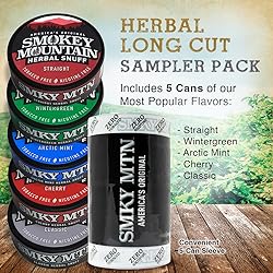Smokey Mountain Herbal Long Cut – 5 Can Sampler Box - Straight, Classic, Wintergreen, Arctic Mint & Cherry - Tobacco Free and Nicotine Free Snuff