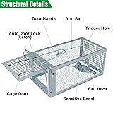 - Instruction: 1. Quantity: 2 pack humane rat trap 2. Color: silver 3. Size: 10.6* 5.5* 4.7" 4. Material: light weight galvanized steel 5. Scope of application: indoor and outdoor How to use? 1. Put the door handle into the 4 holes 2. Pull up the door lock to the top 3. Make the arm bar through the door handle 4. Press down the arm bar to open the door 5. Insert the arm bar into the hole 6. Add bait on the pedal and place trap Matters needing attention: Many of the square cuts in the cage are sharp and need to be taken care to avoid scratches
