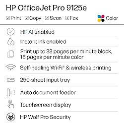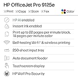 Sold as 1 Each FROM AMERICA'S MOST TRUSTED PRINTER BRAND – The OfficeJet Pro 9125e is perfect for offices printing professional-quality color documents like presentations, brochures and flyers. Print speeds up to 18 ppm color, 22 ppm black. UPGRADED FEATURES – Fast color printing, copy, fax, auto 2-sided printing and scanning, auto document feeder, and a 250-sheet input tray. WIRELESS PRINTING – Stay connected with our most reliable dual-band Wi-Fi, which automatically detects and resolves connection issues. HP APP – Print, scan, copy, or fax right from your smartphone with the easiest-to-use print app.