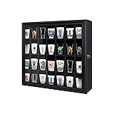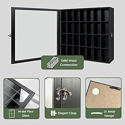 100% Polyester Quality --- Solid Wood Construction - Made from 100% solid wood with gallery profile. Durable and friendly for the environment. Beautifully handcrafted and finished in a polished black finish. Hinged cabinet front door protects your collectibles from dust and dirt. Clear plexiglass front for crystal clear definition. Multi-purpose display cabinet --- Use it to organize and display your precious collection of shot glasses, amiibo, funko pop, mini perfumes, crystals, rocks, miniatures, figurines, Disney collectibles, and much more. No more hiding your collectibles in boxes and drawers where no one can see them! Now you can proudly see all your collectibles in a glance safe tucked away in a display shelf. Usage - Shot glass display case is perfect as thoughtful gift for men and women during occasions like Father’s Day, Mother’s Day, Children’s Day, Birthdays, Christmas, or simply as a token of appreciation. Display your collection proudly and complements a variety of home décor: mid-century, bohemian, modern, rustic, vintage, minimalist, and classic style. Wall mounted with mounting hardware included. Size - 18” x 16” divided wall display cabinet with 28 slots. Color: Black.