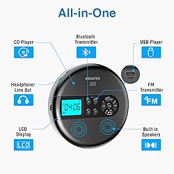 - Discover the MEGATEK CP27BR, a versatile cd player portable design built for music lovers who want more from a traditional player. This compact unit combines the classic feel of a Walkman CD player with modern features, giving you the flexibility to enjoy music anywhere. Whether you call it a CD Walkman, a Discman CD player, a small CD player, a mini CD player, or even a car CD player, the CP27BR delivers clear sound, multiple playback options, and reliable performance. With support for CDs, CD-R/RW, CD-G, MP3 CDs, and audiobook CDs, plus playback of MP3, WMA, and WAV audio files, this portable CD player ensures all your music is covered. Bluetooth RX/TX lets you stream from your phone or transmit wirelessly to Bluetooth headphones or speakers, while the FM transmitter connects to your car stereo for seamless in-car listening. Dual stereo speakers, headphone output, 5 EQ presets, and a convenient LCD display make it easy to enjoy music your way. Compact, lightweight, and equipped with a 2000mAh rechargeable battery, the CP27BR is built for extended listening on the go. With 60-second anti-skip protection, you can count on uninterrupted playback whether you’re driving, traveling, or relaxing at home.
