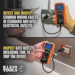 VERSATILE FUNCTIONALITY: Measures AC/DC voltage up to 600V, 40MOhms resistance; additional features include audible continuity, battery test and receptacle test modes DETECT COMMON WIRING FAULTS: Detect and identify common wiring faults using receptacle test mode, ensuring electrical safety and proper functionality of GFCI receptacles TRIP TIME DISPLAY: LCD readout shows the time required to trip a GFCI device, allowing for quick and accurate troubleshooting BATTERY TEST AND FIND MODE OPTIONS: Battery test feature for checking 9V and 1.5V battery functionality, while find mode easily identifies circuit breakers to a corresponding receptacle BACKLIT DISPLAY: LCD shows clear readings in low-light conditions for enhanced visibility CONVENIENT FEATURES: Test lead holders on the back of the meter, kickstand and optional magnetic hanger (Cat. Nos. 69445 or 69417) for hands-free operation COMPLETE PACKAGE: Includes carrying case, test leads with CAT III/CAT IV safety caps, receptacle test cord, instructions, and 2 x AAA batteries