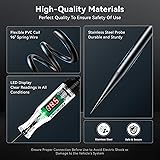 PRECISE 3-48V DIGITAL READOUTS: Stop guessing with dim incandescent bulbs; this circuit tester features a clear LED digital display that provides accurate voltage readings with 0.1V resolution; covers wide 3-48V DC range to accurately diagnose battery health, bad alternators, and fuse status on cars, trucks, and hybrids INSTANT DUAL-COLOR POLARITY CHECK: Quickly identify positive and negative poles without checking the number screen; the bidirectional LED indicator lights up red for positive and green for negative; simplifies the installation of stereos and dash cams by preventing reverse wiring and short circuits INTEGRATED ANTI-LOST PROBE PROTECTION: Designed with an integrated probe guard that slides or attaches to the wire to prevent loss; protects users from accidental stabs when reaching into toolboxes; ensures the stainless steel needle is always safe and ready for piercing wire insulation COMPUTER SAFE & DURABLE CONSTRUCTION: Engineered with low-current draw to safeguard delicate ECUs and vehicle sensors; constructed with a rugged ABS body and shatter-resistant acetate material to withstand drops, grease, and daily wear in busy garage environments FLEXIBLE 96 INCH REACH FOR ANY VEHICLE: The premium extended spring wire stretches up to 8 feet to easily test tail lights from the battery ground; keeps your workspace clean without tangled wires; the backlit screen ensures clear visibility in dark footwells or under the chassis