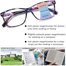 【Multifocus Lenses】Progressive reading glasses features multifocus lenses with 3 different visions. The bottom part is full-power magnification for reading. The middle part is slightly reduced power magnification for working on a computer and the top part is half-power magnification for walking, shopping and so on(Tips: For first-time wearers of progressive multifocus reading glasses, it may take 1 to 3 weeks to get used to them) 【Products Size】This progressive multifocal reading glasses feature a standard size frame (lens width:50mm, bridge width:18mm, arm length:140mm,frame width:135mm) Recommended for average face sizes. If you prefer a snug fit or have a petite face, please check measurements before purchase 【Blue Light Glasses】Our blue light blocking reading glasses can effectively filter harmful blue light from computer or phone screens to protect your eyes, help to relieve your eye tiredness and prevent asthenopia. You sleep better after wearing these transition reading glasses 【Quality Material】Multifocus reading glasses for women are made from superior plastic lenses and frames with spring hinges. The plastic frame is lighter than metal ones that provide you a more comfortable wearing experience. What's more, spring hinges make these progressive readers adjustable to fit your face and thanks to the built-in nose pads, there is no impression on your nose bridge any more 【Pattern Print Design】You look attractive in these pattern print reading glasses. 4 Pack stylish pattern design multifocal reading glasses match your daily outfits well which are perfect to wear in office or at home and no matter where you are, these progressive blue light readers are special accessories of daily life