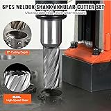 Premium M2AL High-Speed Steel & High Compatibility: With excellent wear resistance and high-temperature resistance, this annular cutter set has a longer lifespan, enduring the test of time and providing lasting support for your work. Our accessories are compatible with almost all major brands of machinery. Innovative Geometric Blade: Our mag drill bits feature unique pointed and flat blades to ensure each blade carries a moderate load, speeding up the cutting process. Say goodbye to chip jams and hello to smoother, faster cutting across various materials. Large Capacity Circular Groove: Powerful chip ejection capability ensures smooth chip discharge, preventing jams and increasing efficiency. Our annular bits provide fast drilling speed for smoother operations. On-the-Go Convenience: This slugger cutter comes with a carefully designed portable case with a comfortable handle for easy transport anytime, anywhere. The foam design enhances durability, ensuring tool security. All-Inclusive Package: This HSS standard kit includes six Weldon shank cutters (1", 1-1/8", 1-1/4", 1-1/2", 1-3/4", 2") and two 6.34mmx103mm pilot pins. The pilot pins secure workpieces and provide multiple functions like positioning, coolant control, and chip removal, ensuring seamless drilling.