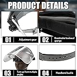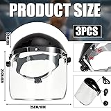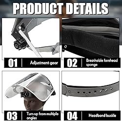 Package Quantity: get ready to experience enhanced safety with 3 pieces of work masks included in one package; For ease of transportation, the product requires installation and the PVC panels can be bent in an arc PET Material Construction: quality is an assurance with the anti fog protective full shield on your face; It is made primarily of PET material, this material can effectively protect the face Safe and Adjustable Design: the grinding face mask shield offers the advantage of adjusted fitting; Use the ratchet knob on the side of the shield to adjust the headband until it's snug and comfortable; Thanks to the design, your shield will stay in place Sweat Absorbent Feature: the inside of the forehead is equipped with a sweat absorbent sponge, which makes the face mask shield for grinding can be worn without stuffiness or tightness on the head while being lifted, and the aluminum wrapped face screen can be freely turned up and down 180°, making it convenient for observation during construction operations; This keeps you comfortable for a longer period, maintaining a dry, clean, and clear vision Wide Application: our full face mask shield is not restricted to a particular setting or activity, ideal for grinding, carpentry, DIY tasks, yard work, hedge trimming, car repairs, cutting metal and so on