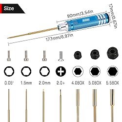 PACKAGE INCLUDES-Featuring 3 Hex Screwdrivers(0.05", 1.5mm, 2.0mm), 1 Phillips Head Screwdriver(2.0mm+), 3 Nut Drivers(4.0BOX, 5.0BOX, 5.5BOX). This Screw Driver Tool Set will get you the most commonly used wrenches found on 1/18 1/24 mini crawlers SPECIALLY DESIGNED FOR MINI CRAWLERS-The INJORA Hex Driver RC Tool Kit Set are specially designed for 1/18 1/24 Scale Car TRX4M SCX24 FCX18 FCX24 TRX4M High Trail K10 F150, maintain and repair your car quickly. It will add a serious upgrade to your workbench PRECISION CUT & EXCELLENT FIT-The Tips are HSS Steel tips, super hard, distortion resistant, and were built to withstand the abuse of long wrenching sessions SLIP-RESISTANT GRIP ALUMINUM HANDLE-The knurled handles provide a high leverage, and a high grip surface PRODUCT SPECIFICATION-Total Length: Approx 6.97"/177 mm. Tip size is etched on the handle for easy identification. There a screw holds the tip in place so you can be sure it wont come loose or strip out