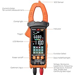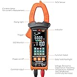 Reliable Clamp Multimeter with True RMS: Accurate AC/DC voltage current, resistance, capacitance, frequency, temperature, diode, continuity test and non-contact AC voltage detection, the Clamp Meter is fully functional and easy to use for labs factories radio-technology and household Intelligent Mode & Multi-function Clamp Multimeter: The default intelligent mode when the meter is on can automatically identify AC/DC voltage DC/AC current, resistance, and continuity measurement signals.It can measure AC/DC voltage DC/AC current, resistance, continuity, capacitance, diode, NCV, firewire, and temperature for all of your measurement needs Large HD Color Screen: Easier to read than a traditional clamp meter. The HD color bright screen is good for working properly in dark places. Avoid reading the measurement value difficulty under direct sunlight. It is a good gift for friends and family Great Helper: True Rms 6000 Counts Non contact voltage tester is a perfect troubleshooting amp meter tools, you can accurately troubleshoot vehicle or internal electrical problems in a fraction of the time and get the job done more efficiently.The continuity tester made troubleshooting become more easy Advanced Design Digital Clamp Meter: The multimeter tester is built-in data hold、flashlight、auto-off features. Jaws can hold test leads and are more portable Low Pass Filter: When Measuring AC Current, The Meter will Automatically Turns on the Internal Low-pass Filter to Filter Out High-frequency Currents