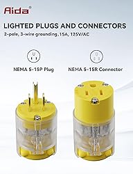 AIDA Lighted Plug and Connector Set, Straight Blade Cord End Replacement, 15 Amp 125Volt, NEMA 5-15P & NEMA 5-15R, 2 Pole 3Wire Grounding, Yellow, 1 Set