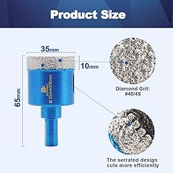 Size --1-3/8"(35mm), diamond height 10mm, total length 65mm,Triangle shank diamond core drill bit Wide Applications --Diamond core bits are worked great for dry drilling holes through hard porcelain tile, ceramics,bathroom tile,granite & marble, masonry, hard plastic with ease. Using water could prolong the lifetime Super Quality Raw Material --Using vacuum brazed technology ,which increases resistance to temperature and friction,to make the diamond particles better attach to the core steel,imporve the performance and lifetime.Constructed with high grade diamond grit for effortless cutting and improved durability in tough applications.High-quality core steel body helps to be more efficient and durable, not easy to deform High Performance --Special design of spiral groove at the top of bit helps for chip removal,Wax inside the drill bit helpful for Cooling and Lubrication Machine --Suitable for any electric drill,hand drill,Bench Drill, When use Angle Grinder,please install angle grinder drill chuck