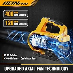 - HEINPRO Cordless Leaf Blower | Compatible with DeWalt 20V MAX, Tool Only Meet the HEINPRO cordless leaf blower – your ultimate solution for effortless lawn care. Designed for use with your existing DeWalt 20V MAX battery system (tool only), this powerful battery leaf blower delivers professional performance without the cord. Featuring advanced axial fan technology, this battery powered leaf blower generates an impressive 400 CFM air volume and 120 MPH wind speed – outperforming traditional blowers with better airflow and heat dissipation. The built-in overload protection ensures safety during extended use. Weighing just 3.6 lbs, this cordless leaf blower lightweight design allows easy one-handed operation, while the rubber-wrapped handle provides secure grip comfort. The protective bottom bracket offers stable placement anywhere. Ideal as blowers for lawn care, yard cleanup, and driveway maintenance, HEINPRO leaf blowers battery powered combine power with portability. Experience the freedom of cordless cleaning today!