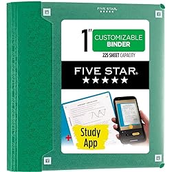 - LASTS ALL YEAR. GUARANTEED! The Five Star 1" Customizable Plastic Binder makes it easy to store and organize your papers all year long. Scan, study and organize your notes with the Five Star Study App. The clear front pocket on the binder makes any paper compatible with the Five Star Study App, so you can access your notes, handouts and more from any device. This 1" durable binder holds up to 225 sheets, when using 15 lb. filler paper. Three D-rings allow for increased paper storage and helps keep 3-hole punched sheets securely in place. It holds letter size 8-1/2" x 11" sheets. The flexible spine structure lays flat for easy desktop use. Includes a 3-pocket divider to keep loose sheets neatly organized inside the binder. The binder’s durable, one-piece plastic construction withstands frequent use and helps protect your contents from damage. Available in Black, White, Tidewater Blue, Forest Green, Fire Red and Harvest Yellow. Colors chosen for you will vary. Guarantee is valid for one year from purchase or delivery date, whichever is longer. Does not cover misuse.