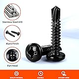 Self drilling screws have a drill bit point. Pan heads are slightly rounded with short vertical sides. Phillips drive is x-shaped for installation with a phillips screw driver. Material: High Quality Stainless Steel 410; Exterior Finish: Black Finish. Screw type: Pan Head Self Drilling screws; Screw Size: #8; Screw Length: 3/4 Inch. Package: 100 x Pan Head Self Drilling Screws #8 x 3/4". Ideal use for wood, metal or other tough materials.