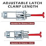 - Features: Built to bring user comfort, the red vinyl solid handle of these toggle clamps with carrying capacity of 2000 lbs reduces hand fatigue from long term use, provides a sturdy grip and makes operation easy. These toggle clamps with red handle boast an impressive carrying capacity of 2000 lbs, making your work stay secure and in place with no fear of slipping or sliding. Specifications: Material: 4mm thick cold rolled carbon steel with galvanized coating and red vinyl solid handle Color: shown as picture Size: about 7.87 inches in maximum length Adjustable distance: from 1.86 inches to 2.58 inches Carrying capacity: 2000 lbs Package includes: 10 x Toggle clamps Notes: Manual measurement, please allow slight errors on size. The color may exist a slight difference due to different screen displays.