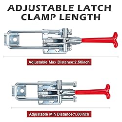 Ample Amount: your order includes a package of 10 toggle latches; With such an ample amount, you can have one for each project or workspace without worrying about easily running out or lost Robust Material and Attractive Appearance: made from 4mm thick cold rolled carbon steel with a protective galvanized coating, these durable toggle clamps are corrosion resistant, oil proof and stain proof; The red vinyl solid handle, not only makes you can hold firmly, but also gives an aesthetic appeal to your workspace Suitable Size with Adjustable Clevis Latch: these metal toggle clamps are about 7.87 inches in maximum length and their distance is adjustable with clevis latch ranging from 1.86 inches to 2.58 inches; They have double nut design, which makes it stronger and safer; The carrying capacity of them is 2000 lbs; These toggle clamps can handle a broad variety of tasks Easy and Convenient Installation: these convenient toggle clamps bring a hassle free setup due to their easy to use design; Simply screw or weld the bottom of the metal toggle latch, adjust the U bolt to the appropriate distance, and tighten the nut for maximum tightness; They have self locking design to avoid the toggle latch from accidentally opening, and they are designed with adjustable cam clamp latch with screws, which can help you quickly adjust the clamping force Universal Application: these adjustable toggle clamps are beneficial for a wide array of applications; They are suitable for mechanical, automotive, jig assemblies, woodworking, metalworking, welding, or for securing heavy item, and they are also nice choice for door clamps, lid clamps, box latches, freezer latches, cabinet latches, barrel smoker latches, and other medium sized fixture components; The flexible adjustment makes them versatile and expands their functional scope