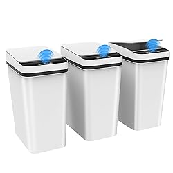 【Motion Sensor Trash Can】 This automatic trash can utilizes advanced infrared sensing technology, 0.1 seconds of sensing automatically open the lid, and automatically close the lid if no object movement is detected within 5 seconds. The touchless trash can is powered by 2 AA batteries (not included) 【3 Pack Automatic Trashcan】Our trash bin set comes in 3 as a bundle which should be the perfect amount for household use. They are the perfect size to fit your bathroom, kitchen, bedroom and living room. The slim design makes them very suitable for placement under sinks, desks, and cabinets 【Sturdy & Waterproof】 Crafted from premium-grade ABS material, this small trash can with lid boasts high durability and resistance to wear and tear. With an IPX5 waterproof rating, the waste basket can adapt to the bathroom splash environment that ensures a long time use 【Slim & Odor Free】 Measuring 9.2"(L) x 6.2" (W)x 12.6"(H) and 2.5 Gallon Capacity, this small garbage can is the perfect size for tight spaces. The smart trash can with lid ensures a fully sealed enclosure that effectively isolates odors from garbage, maintaining a fresh indoor environment 【Versatile & Practical】Whether you need a small bin for your bathroom, bedroom, or office, our wastebasket is a perfect choice. Stackable design enables nesting for easy transport and storage. This garbage bin is also easy to clean and maintain, making it very convenient to use