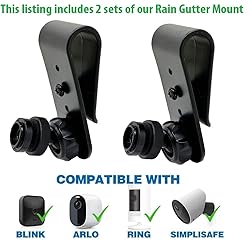 Brand New 2 Pack (2 sets of our Rigit Rain Gutter Security Camera Mount) Our Rigid durable gutter camera mount, with its standard 1/4" thread, supports a wide array of devices including compatible with Blink (Blink round adapter included) XT/ XT2/ XT3/ All-New Blink Outdoor 4th Generatation / 3rd Generation / Indoor Camera and Blink Mini, Wyze Cam Outdoor, Wyze Cam Pan V3, Ring Stick Up Cam, Arlo, Efuy, Simpli-Safe cameras, and certain solar panels. Please note, Not compatible with Ring Spotlight Cam Plus/Pro, Ring solar panels. Cameras are not included Constructed with UV composite durable plastic alloy material, our Gutter Mount can withstand harsh weather conditions. There's no need to worry about realigning your camera or the risk of it falling off Our mount offers 360-degree swivel and 180-degree tilt capabilities for versatile camera positioning. Easily repositionable, it avoids wall damage and doesn't require tools for adjustment Installing our Gutter Mount is simple and straightforward (install with in a Minute). Its design protects your gutters from drilling damage, Just Slide in the camera mounti into your Gutter (Additional Security Screw is included if needed) Elevate your surveillance capabilities with our Gutter Mount. Providing panoramic views for enhanced home security, this rust-resistant mount also positions your camera easy to reach, safeguarding it from damage or theft