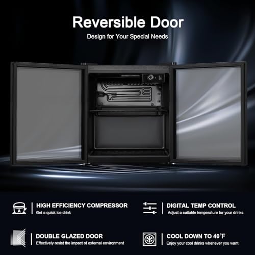 - IDEAL BEVERAGE COOLER: 16.46"D x 16.93"W x 18.5"H mini refrigerator can keep a variety of canned drinks or wine chilled without taking up too much space at your home, dorm, bar or office. It can conveniently hold 48 standard-sized drink cans . The interchangeable design of the left and right doors facilitates the selection of storage locations, adapts to the high-quality needs of different people and different locations.