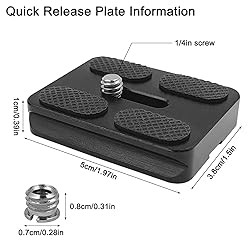 - Specifications: Material: Metal Color: Black The quick release plate replacement size: 50mm(L) x 38mm(W) x 10mm(H) / 1.97"(L) x 1.50"(W) x 0.39"(H). Compatibility: Compatible with 1/4”-20 camera screw. Compatible with Standard for Tripod Ball Head for Camera Tripod Ball head. Compatible with any "Arca-Swiss" type quick release system. Please check the size before ordering. Feature: For camera stability, the top of the plate features a rubberized surface. Anti slip rubber pads can prevent scratches on the camera and tripod. Anti twist locking screws match the international standards Reliable materials and excellent craftsmanship bring you a good user experience. The quick release plate is made of high-quality aluminum alloy, which is durable and lightweight. Although lightweight, it has strong support and reliable stability. The surface has undergone oxidation and corrosion resistance treatment, which can provide you with a long service time. Packing List: 2 x Quick Release Plate 2 x 1/4 "-3/8" screws