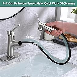 - Besfelos Bathroom Sink Faucet with Pull Out Sprayer, Single Handle Modern Bathroom Basin Faucet with Pop-up Sink Drain Stopper & Deck Plate 1 or 3 Hole, Brushed Nickel