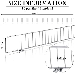 - Features: The retail wire guard rail is not just protective. It is also an organizational tool. It helps to keep your goods organized by serving as a barrier that keeps items contained neatly, thereby facilitating easy access to items. Our package includes 10 retail wire guard shelf rails. This quantity is enough to support your business needs. Specifications: Material: chromium alloy Color: gray Size: about 48 x 3 inches Package includes: 10 x Retail wire guard rail Notes: Manual measurement, please allow slight errors on size. The color may exist a slight difference due to different screen displays.