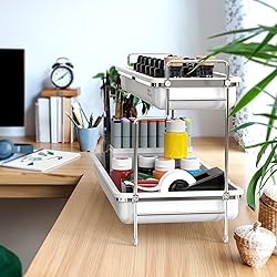 2-Tier Free Standing Countertop Multi-Purpose Rack, easy to install, it has wider taller shelves to ensure fits most spices, jars, cans, canisters, etc. Space-saving design: Utilize in any area of the house to store, sort, and easily access and organize items. Durable and Stable: Sturdy steel material. Rubber grip feet to ensure it does not scratch, slide, or slip countertops. Multi-Purpose: Perfect for storing spices, condiments, grains, canned goods, salt & pepper grinders, or home items such as lotions, make-up, shampoo, nail polishes, cleansers, soaps, etc. Dimension: 7.4''D x 16.3''W x 10.3''H