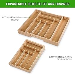 - Bamboo flatware drawer organizer, expandable utensil tray for kitchen, flatware and cutlery holder, adjustable cutlery tray in drawer for flatware and silverware. With an adjustable width between 13 and 19.3 inches, it is compatible with different drawer sizes. The expandable drawer organizer with 6-8 compartments serves not only as a cutlery organizer in drawer to store flatware and silverware like forks, knives and spoons, but also as a kitchen drawer organizer for large utensils like ladles, tongs and whisks. Keep all the kitchen gadgets in the right place and make the cooking hassle-free with your drawer organizer, so that you can save time and effort for fun things during the cooking.