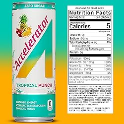 Contains: twelve 12 fluid ounce cans of Accelerator Active Energy Drink, Tropical Punch flavor; This classic blend of orange, pineapple, and cherry packs a punch to bring you sunny tropical vibes. Accelerator sugar free energy drinks for sustained clean energy that accelerates metabolism and enhances focus ZERO SUGAR ZERO CARBS: This zero sugar energy drink supports a clean, healthy lifestyle with no carbs, no artificial colors, and no preservatives SUSTAINED ENERGY: With green coffee bean and green tea extract delivering 200mg of 100% natural caffeine, this healthy energy drink provides sustained energy for gym sessions, cardio, or everyday functional fitness ACCELERATES METABOLISM: Green tea extract and capsaicin create a blend of plant-based thermogenics to rev up metabolism and help burn fat and extra calories. Great for leveling up your workout and weight loss goals ENHANCED FOCUS: Stay sharp and alert with a more natural energy drink that includes 100% Natural Caffeine & CoQ10.