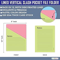 - PACK of 12 counts: Lined Vertical Slash Pocket File Folders with Double Sided Ruled Note Taking Option. Pastel Color. SIZE: 9” x 12” Inch Large, Perfectly Sized for US Letter & A4 Papers. Use Labels or Stickers to Create a File Arrangement System that is more organized and Personalized. STURDY HIGH QUALITY: These Lined Vertical Slash Pocket File Folders are Made of Premium, Heavyweight 350gsm Thick Cardstock, that won't Tear Easily, Providing Complete Protection for your Important Documents, Files, Contracts, Reports , Assignments in Your Backpack, Laptop bag, or Filing Cabinet. NOTE TAKING FILE FOLDER: Organize loose Papers, Documents, Notes and Bills with these Decorative File Folders that keep your File Arrangements more Organized and Personalized. The Designs will keep you Motivated and Organized, Making them Perfect for Office, Home, Teachers, Students, Women, School, College and Business. LINED STYLE: Say Goodbye to Boring Manila Folders by Accessorizing Your Desk with This Colorful, Chic Set of Files. These Fashionable Folders Come in an Assortment of Colors, Patterns. GREAT GIFT FOR EVERY OCCASION - Your Loving one can’t forget to you, it Remind you Every Day.