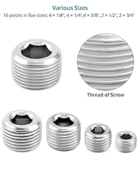 Diverse Size Range: This comprehensive kit includes hex countersunk plugs in five common sizes (1/8", 1/4", 3/8", 1/2", 3/4"). High-Quality Material: The product is made from 304 stainless steel, which features reliable strength and corrosion resistance. Secure Fit: The products features male National Pipe Taper (NPT),compatible with most female threaded pipes in plumbing applications. Easy Installation: The hexagonal countersunk head design allows for easy tightening and loosening with a wrench, providing added leverage for a secure installation. Versatile Application: The product can be sued in plumbing,water treatment, air, liquid, steam, and oil transfer services.