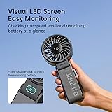 Super Powerful Fan: Featuring a 12-blade design and an upgraded brushless motor, it delivers a powerful breeze and is suitable for scorching summer days; Its advanced engineering ensures maximum airflow to keep you cool in summer days Smart Display at a Glance: The easy-to-read digital display shows wind speed and remaining battery for timely recharge; making it a breeze to stay cool during concerts, outdoor weddings, or while applying makeup Long Lasting Cooling with 19.5 Hrs Max: From early morning commutes to late-night camping trips, enjoy up to 19.5 hours of cooling at speed 1; This personal fan is a lifesaver for long office days, or any outdoor activities 3-IN-1 Solution: Hang it around your neck for hands-free cooling or use it on your desk for a focused breeze; Its innovative design allows for handheld use, desktop placement, or worn around the neck, providing a 3-IN-1 solution for beating the heat Customize Your Breeze: Catering to your personal cooling needs, this small fan offers 5 adjustable wind speeds 150°Folding Fan: With a foldable design, the hand fan can be placed on the desk, allowing you to keep cool while doing makeup or working; The lanyard allows you to free your hands and enjoy the fun of of traveling, shopping Summer companion: This portable fan with 5000 mAh battery is a travel essential; suitable for use when going out, and can also be used as a Thanksgiving, White Elephant gift, Christmas gift for women; The included charging cable allows you to stay cool anytime, anywhere Usage Instructions: Step 1: Slide the switch on the back of the fan to the left to power it on Step 2: Press the button on the front of the fan to activate the fan function Compact & Lightweight Design: Size 1.65" × 3.31" × 7.59" , Weight 8.82 oz Moderate Sound Level: Noise Range 40 dB to 70 dB (measured at a distance of 10-50 cm across Speed Levels 1-5) - suitable for outdoor activities such as camping, disney, travel
