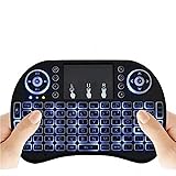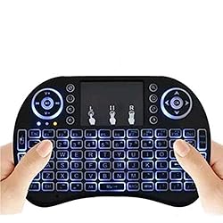 【Backlit Keyboard】Colorful RGB Backlit(Fn+F2 can switch), Multi-media buttons, Direction keys , Power switch,Left and Right Buttons, Scroll wheel. Wireless mini keyboard with built-in rechargeable lithium-ion battery.Size: 5.77*3.83*0.75 inches. 【Multi-Function】Mini wireless QWERTY keyboard, touch pad combo,LED backlit. 92 keys QWERTY keyboard + touchpad with multi-finger functions, single finger click for left mouse, two-finger click for right mouse and double finger drag for scrolling on the screen,making it faster and more convenient for you to move to choose what you want. 【2.4G Wireless Plug & Play】 2.4GHz Mini Wireless QWERTY keyboard connected by the included usb dongle, plug and play. Small and handheld design, innovative shape,perfect for Android TV Box , HTPC ,PC etc. 【Handheld Ergonomic Design】The ergonomic handheld design is easy to carry and operate. The portable design allows you easily to handle and use, High sensitivity touchpad with 360-degree flip design. 【Wide Compatibility】Suitable for Pad/PC/android TV box/Google TV box/Xbox360/PS3/HTPC/IPTV, etc.Compatible OS:Windows 2000/XP/Vista/7/8/8.1/10, Linux, Andriod
