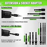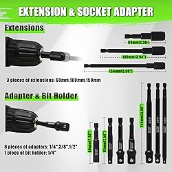 - 28PCS NUT DRIVER SET MAGNETIC: This bits holder set includes 9 PCS metric nut driver set (6~14mm), 9 PCS SAE nut driver set (1/4~9/16''), 6 PCS impact socket adapters (1/4'', 3/8'', 1/2''), 3 PCS 1/4'' quick release magnetic extension rod & bit holder (60mm 100mm 150mm) and 1 PCS drill bit extension HIGH QUALITY: The impact driver bit is made of Cr-V steel, which has higher shock resistance and hardness. The drill bit is made of high quality S2 alloy steel, with sturdy hardened & tempered construction. The surface is blackened by manganese phosphate, which has the ability to resist wear, oxidation and corrosion. VISIBILITY & PORTABLE: Each nut driver size is engraved by a powerful roller stamping machine, making it easy to identify and wear-resistant. High-quality storage box ensures secure retention of nut driver, preventing them from loosening or falling during storage and transportation. WIDELY USED: The impact nut driver set magnetic features a universal 1/4" hex shank for easy attachment to a variety of tools, including drills, electric screwdrivers, socket wrenches, pneumatic impact wrenches, cordless drills, and screw guns. This perfect for DIY enthusiasts and professionals CHOOSE SUNHZMCKP TOOL BRAND: The deep nut driver set is widely used for home DIY, car repairs, woodworking projects, professional mechanics, and more. we are dedicated to ensuring 100% customer satisfaction. If you have any problems with the magnetic nut driver, please feel free to reach out to us.