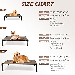 Stay Cool and Dry: The dog bed elevates pets more than 7.4 inches off the ground, which allows air to circulate underneath and provides a cooling environment for your pets. Raised dog cot is great for keeping your pet warm in the cooler months and cooler in the warmer months both indoors and outdoors. Premium Fabric Materials: The Textilene dog bed mat allows air to flow, is sturdy and breathable. Pet hair, dirt, grime won't stick to the tight mesh, just hose off with water and allow to dry. You can also wipe it clean with a wet towel. Sturdy Steel Construction: Powder-coated steel frame is rust-resistant and built to withstand harsh outdoor conditions, it can support the weight of your medium-sized dog. Designed for quick removal and installation, make the bed portable and perfect for indoor, outdoor, picnic, camping, training. Enlarged Rubber Feet Pads: The non-slip rubber feet protect floors from scratches and keep the pet bed from sliding when your dog jumps on or off. The non-slip feet provide extra stability during movement, making this ultra-comfortable bed ideal for use on a variety of surfaces. Easy to Install: The cooling dog cot can be installed without the use of any tools, screws and can be installed directly with the plastic connector. It only takes a few minutes of your time, and presto! It's up and ready for your pet to enjoy in.