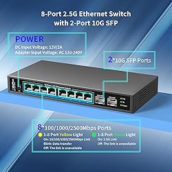 - 10 Port 2.5Gb Unmanaged Ethernet Switch with 8* 2.5G Base-T Ports, 2* 10G SFP+ Ports. GiGaPlus 2.5Gbps Network Switch for 2.5Gbps NAS/PC, WiFi6 Router, Wireless AP. Fanless Design, Plug and Play