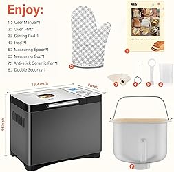 19 CUSTOMIZED NUTRITIONAL PROGRAMS and UNIQUE FULLY PROGRAMMABLE MODE: Bread maker has 19 menus: gluten-free, sourdough, jam, yogurt etc.. You can customize each stage of bread machine's operation time 100%(Industry Top-Tier). Add ingredients, press start—KBS bread maker auto-handles: autolysing, basic rise, degassing(Retains open crumb), second rise, reshape(Perfectly shaped dough), last rise, airy no dense. All settings will be saved for next use. One-touch start Custom Mode. These advanced features are both pros handy and newbies friendly PREMIUM NON-STICK CERAMIC PAN and 360° PLANETARY MIXING TECH: Ceramic bread maker features a PTFE/PFOA/Pfas/lead-free non-stick ceramic pan. Green and healthy, suitable for the whole family. 3,000°F ultra-high-temperature processing technology gives the ceramic bread pan excellent thermal conductivity. KBS bread maker's 5-layer antioxidant metal and ceramic construction reinforces the bread pan's scratch resistance. Ceramic paddle uses 360° planetary mixing technology to knead dough thoroughly, creating a flexible honeycomb internal structure TRUE 2 LB CAPACITY and 15 H DELAY and 60-MIN KEEP-WARM: 2 lb bread machine is equipped 15H delayed start feature lets you enjoy freshly baked bread anytime. Large bread machine is equipped with PID & NTC temp control system, 1H heat retention function to ensure optimal bread temperature of 135℉. Pfas free bread machines have 15-min power-off protection. If power is restored within 15-min, it equipped with UPS smart chips can continue to execute original program. Breadmaker is available in 1lb, 1.5lb, 2lb loaves with light, medium, dark crusts STRONG 650 W MOTOR 4-SEASON CONSTANT TEMP 360° CONVECTION FOR PERFECT BAKING: 650W convection bread maker 30% faster baking, quick bread done in 1.5h! Uses only 0.2 kWh per use—true money-saving! 4-season constant temp system, auto-matches best rising curve, locking dough temp at 100℉—great bread every season, no more failed bakes. Automatic bread maker uses 360° full-surround convection paired with 16-dimensional heat sensors, plus all-around convection system and heat radiation setup! Every slice gets a crispy crust and fluffy interior PRECISION ENGINEERED 316 STAINLESS STEEL and SMART DIGITAL PANEL: Programmable bread maker machine is made of seamless 316 stainless steel and is ideal for long-term users! Brushed stainless steel bread maker highlights its luxurious texture, perfectly matches modern style of American kitchens. Horizontal bread maker has a high-definition LED screen and an 360° viewing window. Materials are 100% recyclable, KBS black bread machines not only practicing concept of environmental protection, but also with hardcore durability COMPLETE ACCESSORIES 2 YEARS HASSLE-FREE AFTER-SALES SERVICE: KBS bread machine maker is supplied with 1 non-stick ceramic pan, 1 glove, 1 measuring cup and spoon, 1 hook, 1 paddle, 1 manual, 1 recipe and 1 quick start guide. Compact bread maker is ETL certified with 2 years of after-sales service and lifetime technical support! Fixes on first contact! You get a recipe book with 53 recipes, real bread pics, step-by-step instructions—super simple to get the hang of! A team of experienced engineers,well-trained service team, responding within 12H