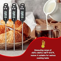 Instant and Accurate Reading: a feature of the digital thermometer is its ability to provide quick and highly precise temperature readings in just few seconds; This ensures that your meals are cooked to the optimal temperature, enhancing food safety and enriching taste Ease of Use: practicality and convenience are at the heart of the food thermometer; Their straightforward design ensures ease of use, making temperature measurement an easy task; No need for fancy gadgetry know how, just insert the stainless steel probe into your meat, and you'll have a quick temperature reading Compact and Convenient Size: each digital candy thermometer measures about 9.65 x 0.98 inches, making them compact and easy to handle; Despite their small size, they deliver performance equivalent to or exceeding larger, bulkier models; Fits conveniently in your kitchen drawers or can be hung with the kitchen utensils Comprehensive Package: the package includes 6 pieces of waterproof thermometer for water to cater to your cooking needs; Whether hosting a large gathering or preparing meal prep for the week, these thermometers are your reliable kitchen companions that offer standard quality every time Broad Application: the kitchen thermometer for cooking has a myriad of uses; Whether you're cooking beef, lamb, pork, turkey, or chicken, this kitchen tool ensures a suitable temperature reading every time; With its broad usage, it makes an ideal kitchen tool for professional chefs and home cooks alike; The thermometer also excels in brewing coffee, milk, or even making cheese and bread