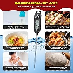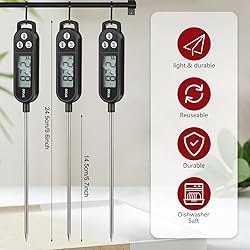 - Features: Made with a blend of durable plastic and a stainless steel probe, the meat candy thermometer promise long lasting use. The robust materials resist rust, corrosion, and damages ensuring longevity. The milk temperature thermometer is waterproof, adding to their durability. Whether you're grilling outdoors in the rain or roasting meat in your kitchen, they can withstand various environments. Available in black colors, they can fit the aesthetics of different kitchen designs. Specifications: Material: plastic and stainless steel probe Color: black Size: about 9.65 x 0.98 inches/ 24.5 x 2.5 cm Package includes: 6 x Instant read meat thermometer Notes: Manual measurement, please allow slight errors on size. The color may exist a slight difference due to different screen displays.
