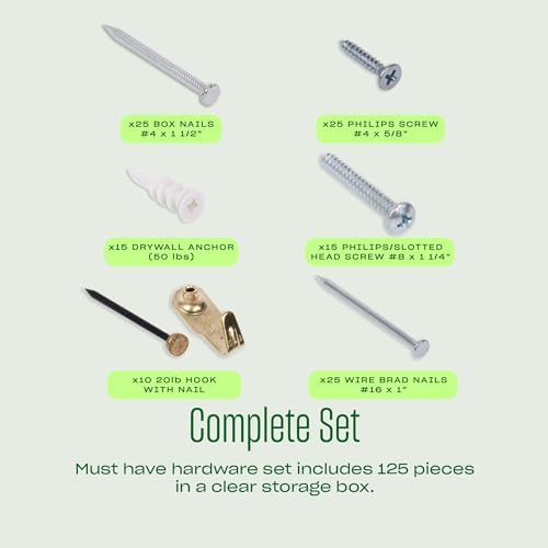 - COMPLETE SET - Must have hardware set includes (25) 1-inch wire brad nails, (25) 1 ½-inch box nails, (10) 20-lb hooks with nails, (15) 1 ¼-inch phillips head screws, (15) 50-lb drywall anchors, (25) ½-inch phillips head screws, and clear storage box
