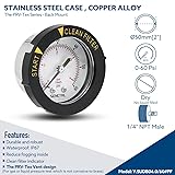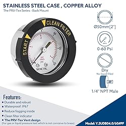 - PRV-Tex Series: The circular dial is encased in a 304 stainless steel casing, providing robustness and corrosion resistance. IP67 waterproofing reduces the occurrence of window fogging caused by internal condensation, thus providing clear readings and weather resistance. Brass and Stainless Steel wetted parts for measuring non-corrosive liquid and gas pressure. Such as water, and oil pressure test. Compatible with swimming pool sand filter, spa pump, air relief valve, water filter pressure tester, etc. Clean filter indicator: Our pool filter pressure gauge is equipped with a clean filter indicator. It consists of a rotatable movable baffle with clear ""Start"" and ""Clean Filter"" markings. Measures pressure with dual scale (0-60 psi/0-4 bar). Display accuracy is + or - 3/2/3% over the entire range of the gauge. Back mount male connection with 1/4"" NPT thread.