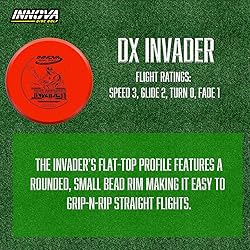 VALKYRIE – A great choice for a first distance driver. The Valkyrie is ideal for new players developing their technique, and it serves well for turnover shots and rollers among the more skilled players. MAKO3 – Reach for the Mako3 when you want dead straight shots to the basket. Straight flying mid-range with limited fade, great disc for one-disc-rounds and beginners. INVADER - The Invader is one of the best driving and approach putters available. Its flat-top profile features a rounded, small bead rim making it easy to grip-n-rip straight flights. DISC GOLF ESSENTIALS – Included in this Innova Disc golf beginner set is a disc golf driver, mid-range, putter and mini. All in DX plastic, which provides an excellent grip in a variety of weather situations. WEIGHTS AND COLORS – Each disc will weight between 170-180g. Disc and Stamp colors will vary. Also includes a limited edition stars stamp Innova mini disc.